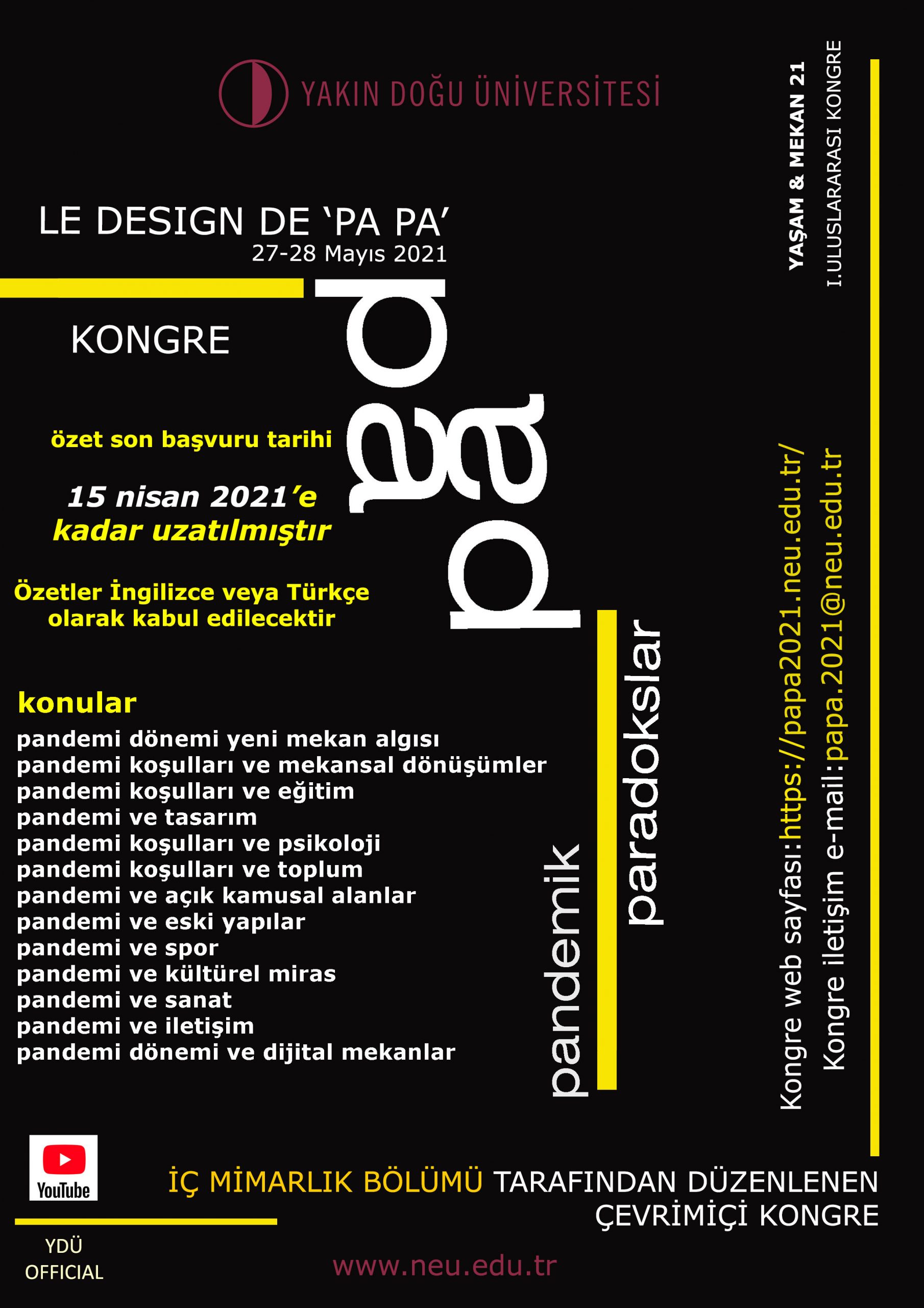Hayatımızda doğru bildiğimiz herşeyi yeniden sorgulamaya başladık pandemi ile… Mekanlarımızı da…Daha önce bizim için hiç önemli olduğunu farkedemediğimiz şeyler, bu gün özlemle uzaktan bakarak değerini anladığımız kavramlara dönüştü. Yeni bir hayata başlamak için, önceki hayatımızı güncellemeye koyulduk. Değişimin zorlukları, her alanda olduğu gibi yaşam alanlarımızda da beklenmedik bir anda kendisini gösteriyor. Bu bağlamda, yaşam alanlarında zorluklar ve gereksinimlerden kaynaklanan değişimler komik ama aslında trajik-olaylar yaşandı ve yaşanmaya devam etmektedir. Bu yaşanılanlar bizleri yeni mekan anlayışına yöneltmiştir. Konferansın amacı, Pandemi dönemindeki yeni mekan anlayışını ve algısını farklı disiplinlerin bakış açısıyla gözler önüne sermektir. Bu bağlamda iç mekan, dış mekan ve kamusal alanların mekan kullanım algısının pandemiyle bilrikte ne boyutta değişikliğe uğradığı ele alınacaktır. Tüm disiplinler bu konuya katkı saylayabilecektir. Pandemi dönemindeki bu mekansal algının değişmesiyle tasarımsal problem toplumsal algıyı ve farkındalığı güçlendirerek, mekan tasarımında üretilebilecek yeni fikirlere yeni bir yol oluşturmaktır. Buradan hareketle gerek lisans, gerekse lisanüstü düzeyinde Pandemik Paradokslar 2021 Konferansı, 27-28 Mayıs 2021 tarihinde YDÜ İç Mimarlık Bölümü’nün ev sahipliğinde gerçekleşecek kapsamlı bir online uluslararası konferansın düzenlenmesi amaçlanmıştır. İki gün sürmesi hedeflenen, çok sesli ve geniş katılımlı bir akademik tartışma ve paylaşımı amaçlayan bu konferansta, Ana Tema Pandemik Paradokslar olarak belirlenmiştir. Tüm disiplinlerin katılım sağlayabileceği konferansımızda alt temalar ise Pandemi Dönemi Yeni Mekan Algısı, Pandemi Koşulları ve Mekansal Dönüşümler, Pandemi Koşulları ve Eğitim, Pandemi ve Tasarım, Pandemi Koşulları ve Psikoloji, Pandemi Koşulları ve Toplum, Pandemi ve Açık Kamusal Alanlar, Pandemi ve Eski Yapılar, Pandemi ve Spor, Pandemi ve Kültürel Miras, Pandemi ve Sanat, Pandemi ve İletişim, Dijital Mekan konularıyla ilişkili çeşitli farkındalıklar, değerlendirmeler, araştırmalar ve farklı bakış açılarının aynı platformda bir araya getirilmesi hedeflenmektedir. Tüm bu yeni mekan kullanım algısı pandemi döneminde başlamış olsada, halen daha varlığını sürdürmektedir. Tüm tasarım disiplinleri ve pandemi dönemiyle olan ilişkişi, güncel pandemik mekan algısı, kapsamlı ve geniş katılımı arzulayan bir tartışma ortamının ve bu tartışma ortamının zenginliğinden türeyen bir yayın yahut bir seçki miktarının yetersiz olduğu gözlemlenmektedir. Öte yandan konferans bildiri kitabının haricinde, konferans sonrasında, seçilen bildirilerin, kapsamlı bir seçkinin oluşturulması gayretiyle, ulusal-uluslararası bir yayına da dönüştürülmesi planlanmaktadır. Bu kapsamda, ülkemizde lisans ve lisanüstü düzeyinde pandemi dönemi yeni mekan anlayışına kaynak oluşturacak, aynı zamanda alana ilgi duyan tüm tasarım öğrencilerine ve profesyonellere hitap edecek, bir anlamda ilk kez yaşanılan bu pandemik paradoks konusununda hafızasını yoklayarak şimdi ve geleceğe yönelik tartışmalara ışık tutacak bir kitabın oluşturulması hedeflenmektedir. Geniş katılımlı bir akademik ve entellektüel üretimi amaçlayan ve kollektif bir çabayla hayata geçirilmesi planlanan bu kitap çalışmasının Pandemi dönemi yeni mekan algısına dair farklılıklar, değerlendirmeleri, araştırmaları ve yenilikçi bakış açılarını bir araya getirmesini umuyor, ve bu konuda çalışan akademisyenlerin, bilim insanlarının, genç araştırmacıların katılımlarını bekliyoruz. Bildiri kabulu hem Türkçe hem İngilizce olarak her iki dilde kabul edilecektir. Bildiriler kör hakem değerlendirmesinden sonra NEUJAF Near East University Faculty of Architecture Dergisinde yayınlanacak, CAMBRIDGE SCHOLARS yayınevi tarafından basılacak olan bildiriler sadece İngilizce olacaktır. Pandemi sebebi ile dijital platformda gerçekleştirilecek olan PAPA 2021 Konferansının, 27-28 Mayıs 2021 tarihlerinde düzenlenmesi planlanmaktadır.YAŞAM VE MEKAN 2021